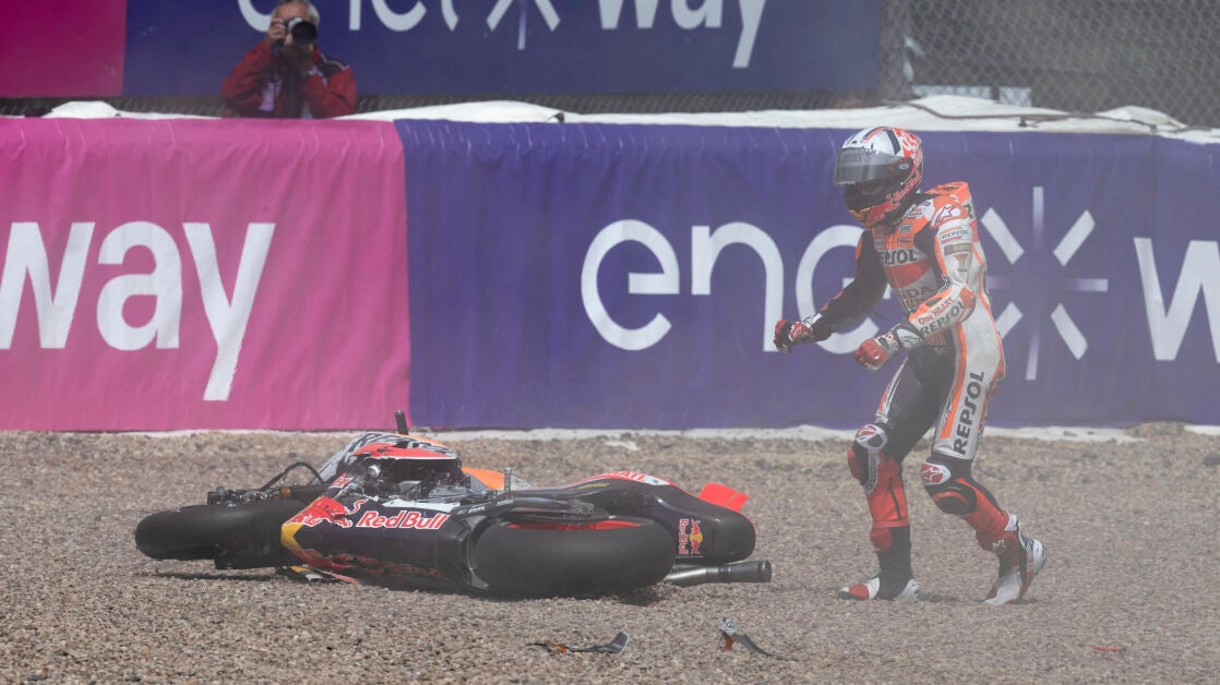 El primer aviso del suplicio en el que se convertiría la mañana llegó en los entrenamientos libres. Marc iba a rueda de Marco Bezzecchi cuando el italiano deceleró de repente provocando un toque con el que ambos estuvieron a punto de irse al suelo. Afortunadamente, la acción no tuvo consecuencias más allá de la reprimenda que el de Ducati se llevó por parte de dirección de carrera.