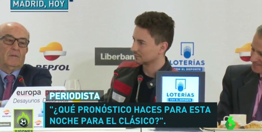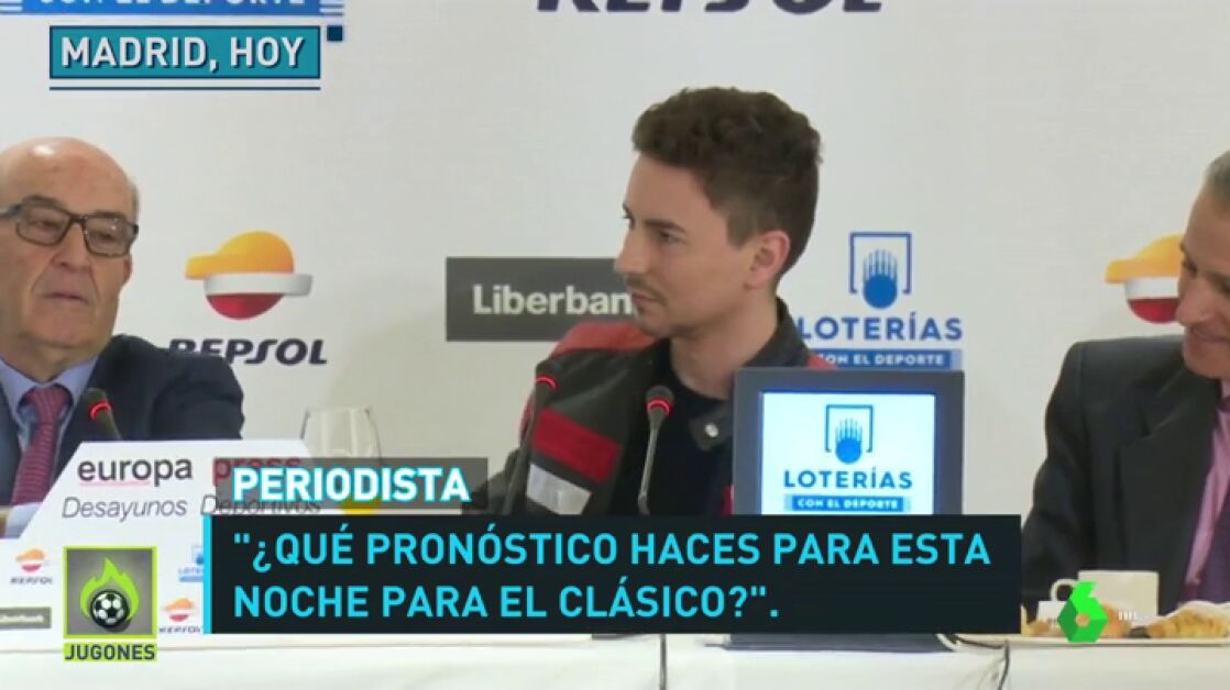 Jorge Lorenzo, piloto de Repsol Honda, acudió a un acto en Madrid en el que le preguntaron sobre su pronóstico para el clásico de Copa en el Bernabéu. La respuesta del mallorquín no tiene desperdicio. Lo vemos en Jugones.