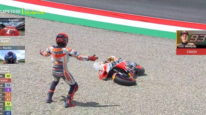 Marc Márquez sigue sin poder terminar una carrera en domingo en este Mundial de MotoGP. Tras caerse en Portugal y Francia, y perderse Austin, Argentina y España, el de Honda se ha ido de nuevo al suelo en Italia.