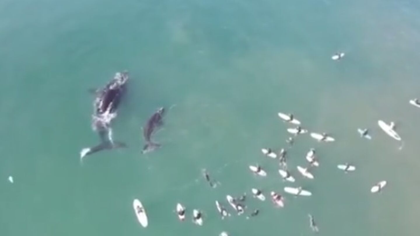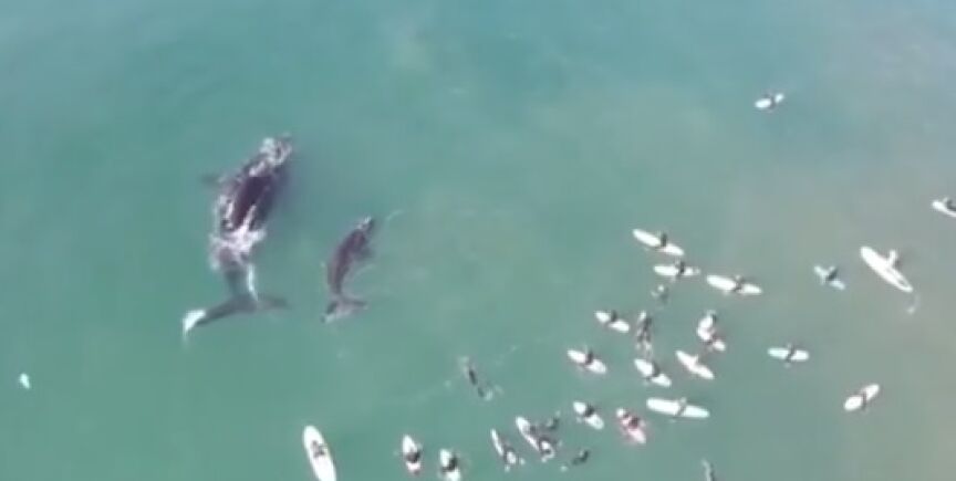 En la costa de Manly, en Australia, un dron captó el momento en el que una ballena y su cría juegan junto a unos surfistas. La pequeña se llega a acercar y uno de ellos estira el brazo para tocarla.