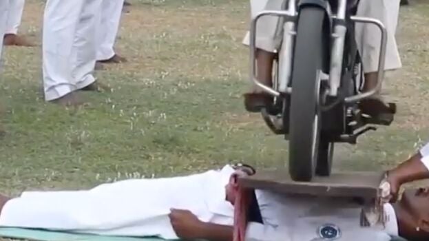 Renshi Pradeep Babu ha conseguido batir un récord en su país. El karateca aguantó tumbado a más de un millar de motos que pasaban por su pecho a través de una plancha de madera.