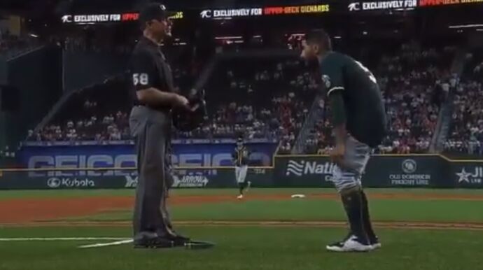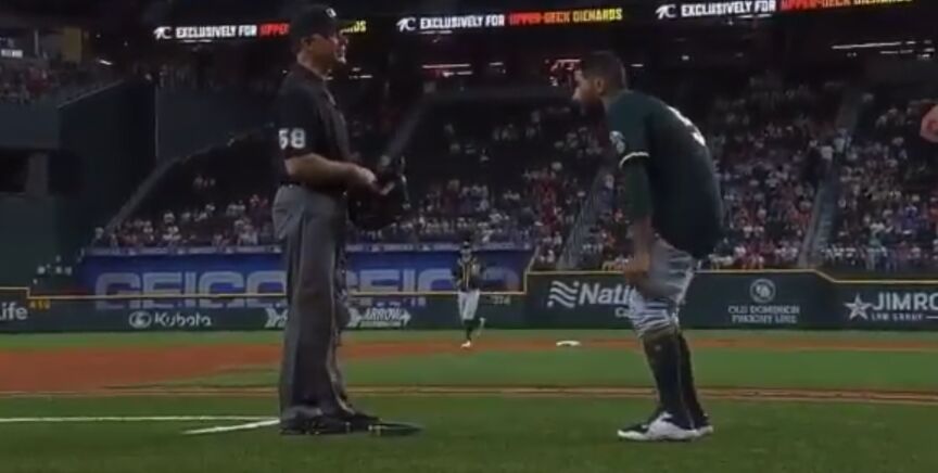 Sergio Romo, pitcher de los Oakland Athletics, tuvo un gesto surrealista delante del colegiado, que se acercó a él para revisar si tenía una sustancia pegajosa para manipular la pelota.