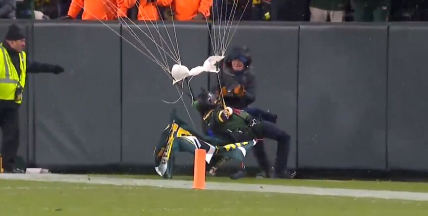 Y es que un paracaidista trató de aterrizar sobre el césped del Lamebau Field sin éxito. El protagonista del suceso calculó mal a la hora de tomar tierra y acabó chocándose contra uno de los muros que separaban la grada del terreno de juego.