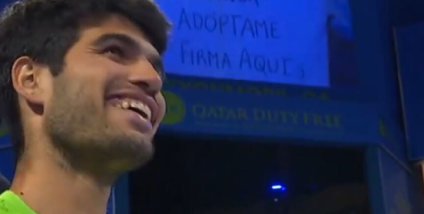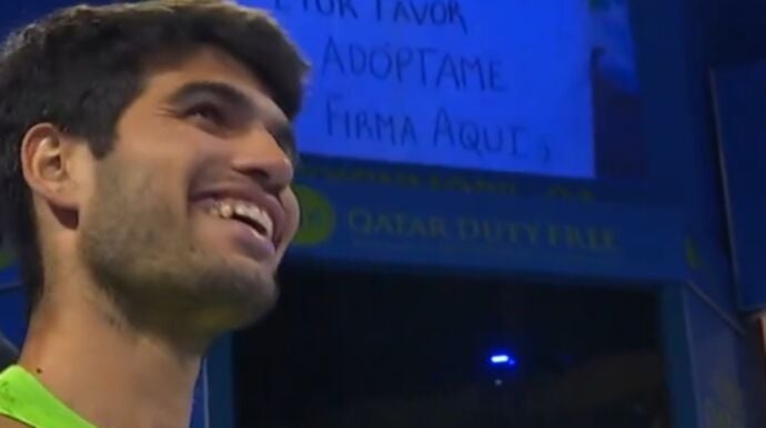 El segundo momento, algo más agradable, ha sido la reacción de Carlitos tras ver en pantalla el mensaje que le mandaba uno de los aficionados presentes en la pista central de Doha. "Carlitos tienes dos opciones: 1. Por favor, adóptame. 2. Firma aquí", ponía en el simpático cartel. Alcaraz no ha sido capaz de contener la sonrisa ante semejante gesto dejando un momento entrañable en una situación de mucha concentración.