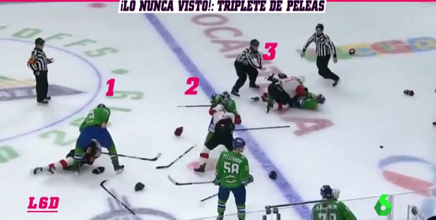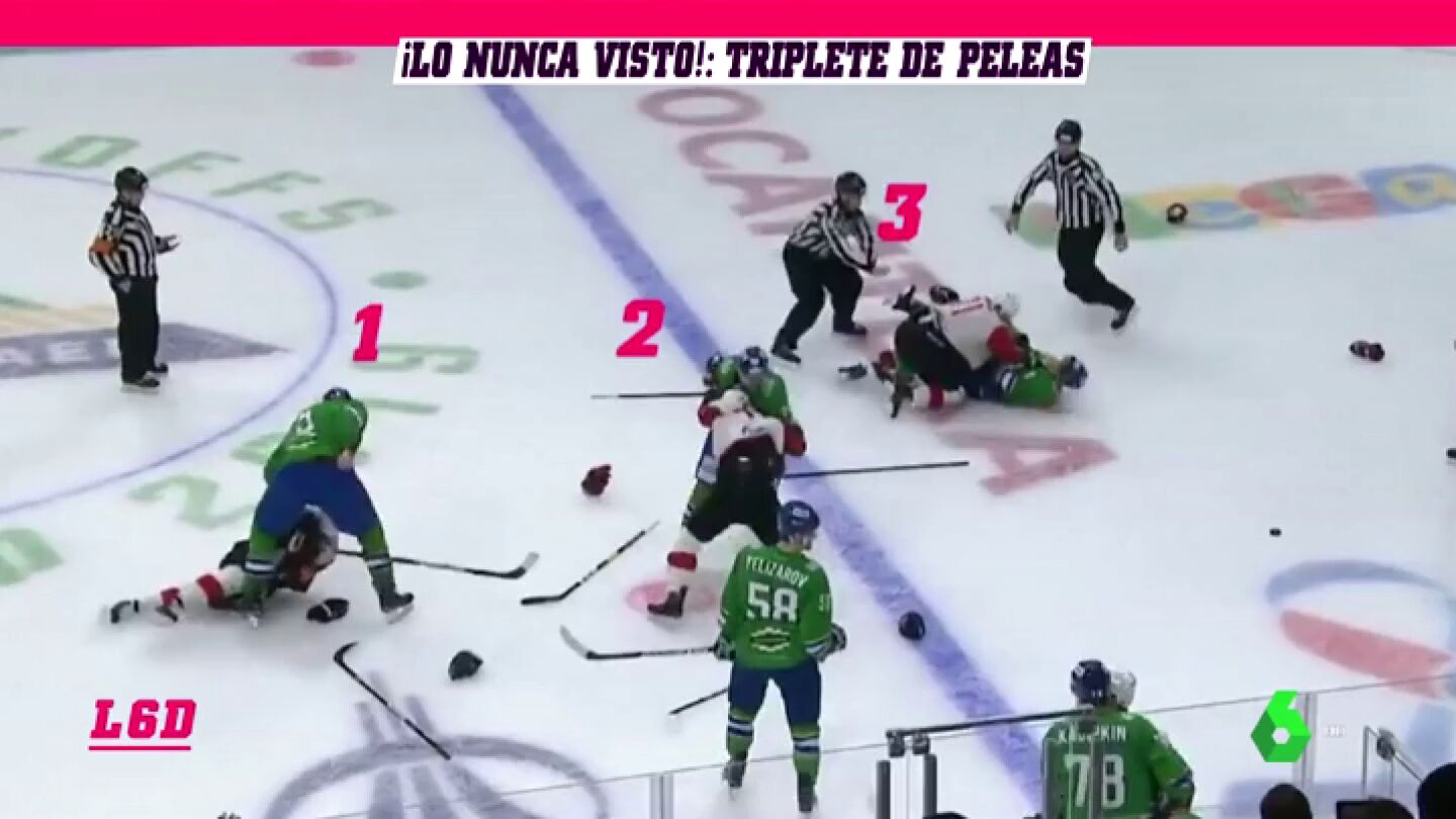 Lo que comenzó como una de las habituales peleas entre dos jugadores en un partido de hockey acabó como un baile sincornizado de golpes entre seis jugadores.