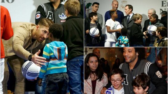 Zidane, Ramos, Marcelo, Felipe Reyes y Llull estuvieron presentes en un acto en el palco de honor del Santiago Bernabéu como parte de la campaña del Real Madrid 'En Navidad, ningún niño sin regalo'. Jugadores y técnico repartieron juguetes entre los niños.