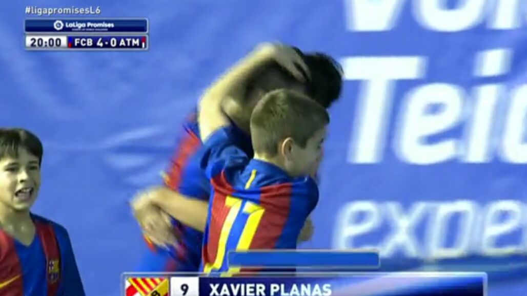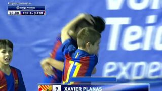 Tremendo zapatazo del jugador del F.C Barcelona Xavi Planas que suponía el cuarto gol para el Barcelona y servía para aumentar aún más la diferencia en el marcador en el partido final de LaLiga Promises ante el Atlético de Madrid.