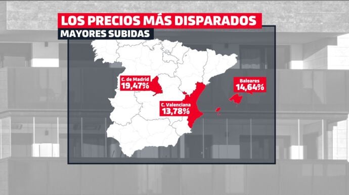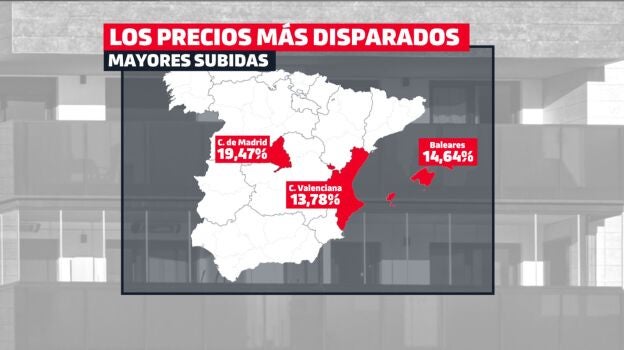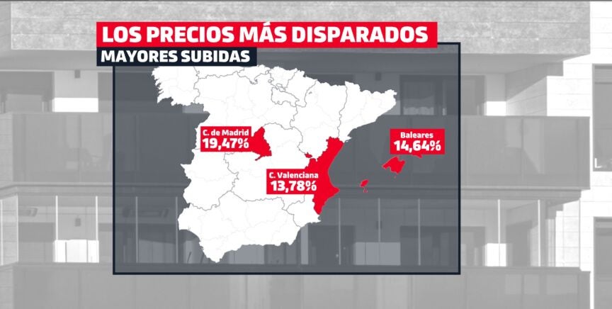 De las 52 capitales de provincia españolas, en 20 de ellas la vivienda se encareció más del 10% en comparación interanual, frente a las 15 del trimestre anterior. Madrid fue la capital en la que más subieron los precios, casi un 21%, seguida de Valencia (+17,5%); Palma de Mallorca (+15,3%); Murcia (+14,9%) y Alicante (+14,7%).