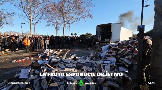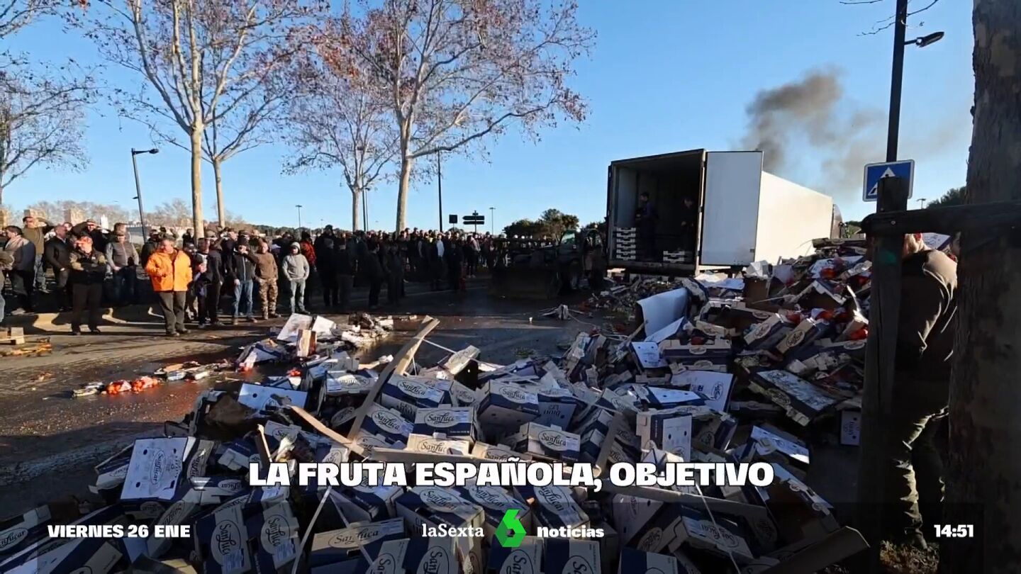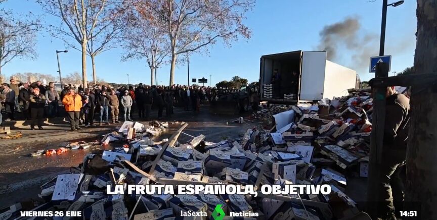 Camioneros españoles están sufriendo ataques de agricultores franceses que están en huelga y que deciden, como parte de su protesta, parar y vaciar camiones que contienen verduras. Además, en el vídeo principal que acompaña a la noticia, se puede ver vino español saliendo a borbotones. "Te preguntan qué llevas, y si es fruta o verdura, te tiran todo", denuncia un transportista.