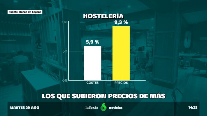 El gerente de una cafetería en el centro de Barcelona asegura a laSexta que se han visto obligados a subir sus precios "por el aumento de costes", pero los precios que la hostelería cobra a sus clientes subieron un 9,3%, lo que suponen 3 puntos más que los costes a los que tienen que enfrentarse, como por ejemplo las materias primas.