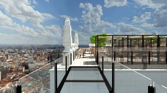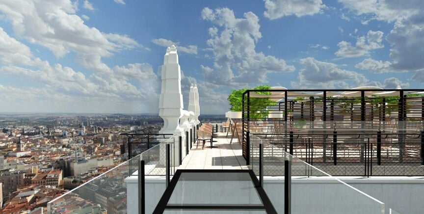 Riu quiere que su hotel sea un punto de encuentro también para los madrileños con la que, aseguran, será la azotea con mejores vistas de la capital desde una altura 26. Una pasarela de cristal permitirá recorrer todo el perímetro del edificio y los precios "no serán prohibitivos".