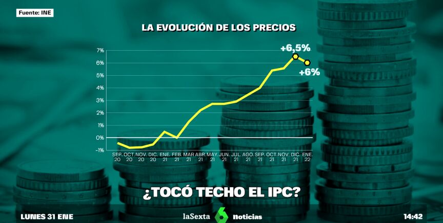 El IPC se ha situado en enero en el 6%, bajando cinco décimas respecto a diciembre de 2021 por la bajada de los precios de la luz.
