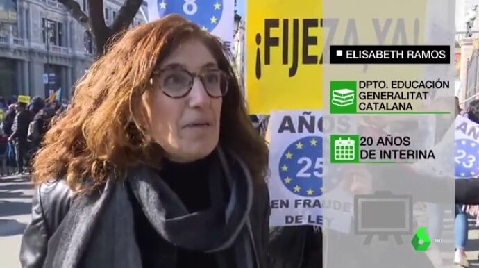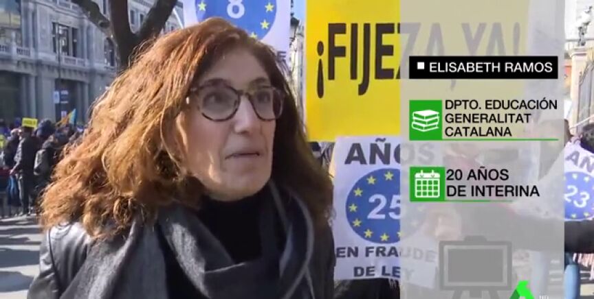 Elisabeth lleva 20 años como interina en Generalitat de Cataluña. Ahora su futuro es una incógnita: "Han sacado mi plaza a convocatoria pública y me han dicho que tengo 50 años y tengo que hacer un examen teórico", cuenta y grita "¡Basta ya de precariedad!" en una manifestación en Madrid.
