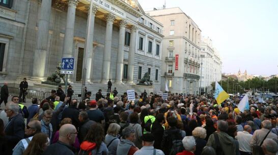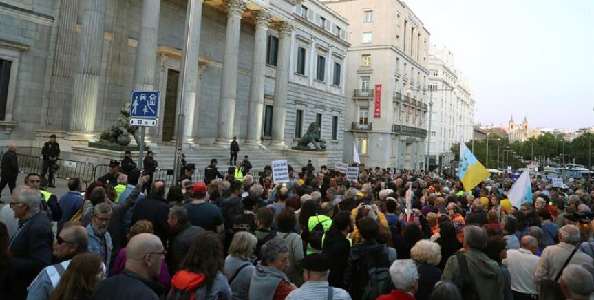 Pensionistas procedentes de diversos puntos de España se concentraron ante al Congreso de los Diputados para exigir que se blinden las pensiones en la Constitución y su revalorización conforme al IPC al grito de "gobierne quien gobierne, las pensiones se defienden".