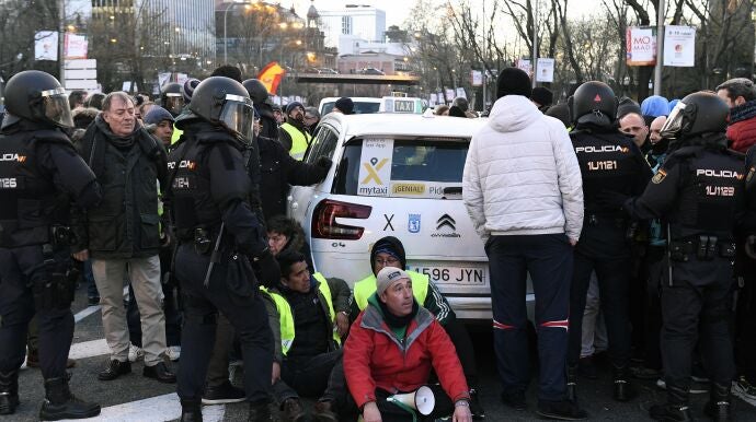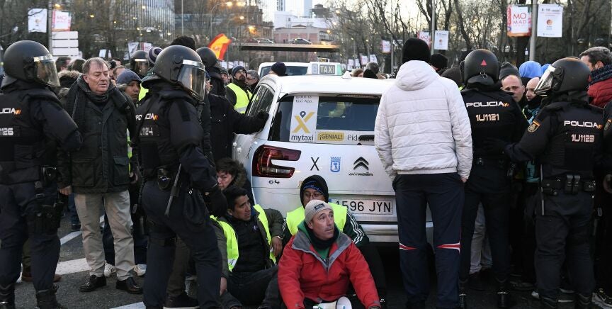 Una huelga indefinida con un debate en la calle entre usuarios y taxistas, que continuará durante la tarde de este lunes con una nueva movilización en Sol.