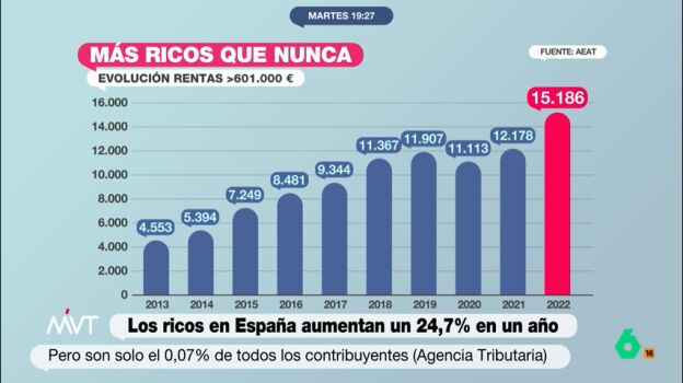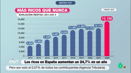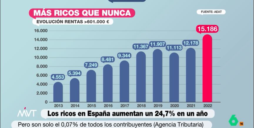Más de 15.000 personas en España declaran que ganan al año 600.000 euros. Es la cifra más alta de la historia, y desde hace diez años no para de subir. A pesar de suponer una cifra muy baja respecto al total de declarantes de este impuesto, siendo del 0,07% de todos los declarantes, entre el año 2007, en el inicio de la crisis económica, y el pasado 2022 los contribuyentes que han declarado rentas superiores a los 600.000 euros han crecido un 43,5% desde los 10.580 declarantes que tenían estas rentas hace más de una década.