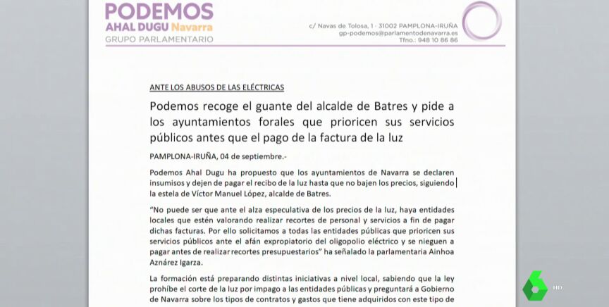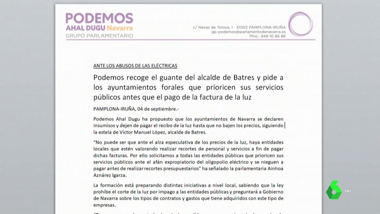 Podemos ha recogido en Navarra "el guante del alcalde de Batres (Madrid)" y ha pedido a los ayuntamientos de la Comunidad Foral que "prioricen sus servicios públicos antes que el pago de la factura de la luz", y se declaren por tanto "insumisos" y "dejen de pagar el recibo de la luz hasta que no bajen los precios".