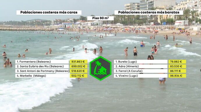 Las poblaciones costeras donde es más caro comprarse una casa de 90 metros cuadrados son: Formentera (931.863 euros), Santa Eulària des Riu (699.002 euros), Sant Antoni de Portmany (518.620 euros), Marbella (502.112 euros) y Sitges (468.605 euros). Por el contrario, los municipios más económicos para adquirir una vivienda con vistas al mar son Burela (79.882 euros), Adra (83.530 euros), Ferrol (86.111 euros), Viveiro (96.934 euros) y Villajoyosa (97.309 euros).