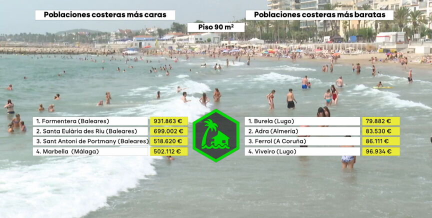 Las poblaciones costeras donde es más caro comprarse una casa son: Formentera (931.863 euros), Santa Eulària des Riu (699.002 euros), Sant Antoni de Portmany (518.620 euros), Marbella (502.112 euros) y Sitges (468.605 euros).