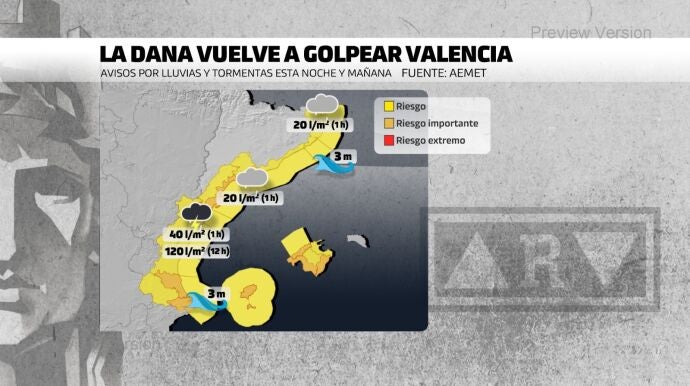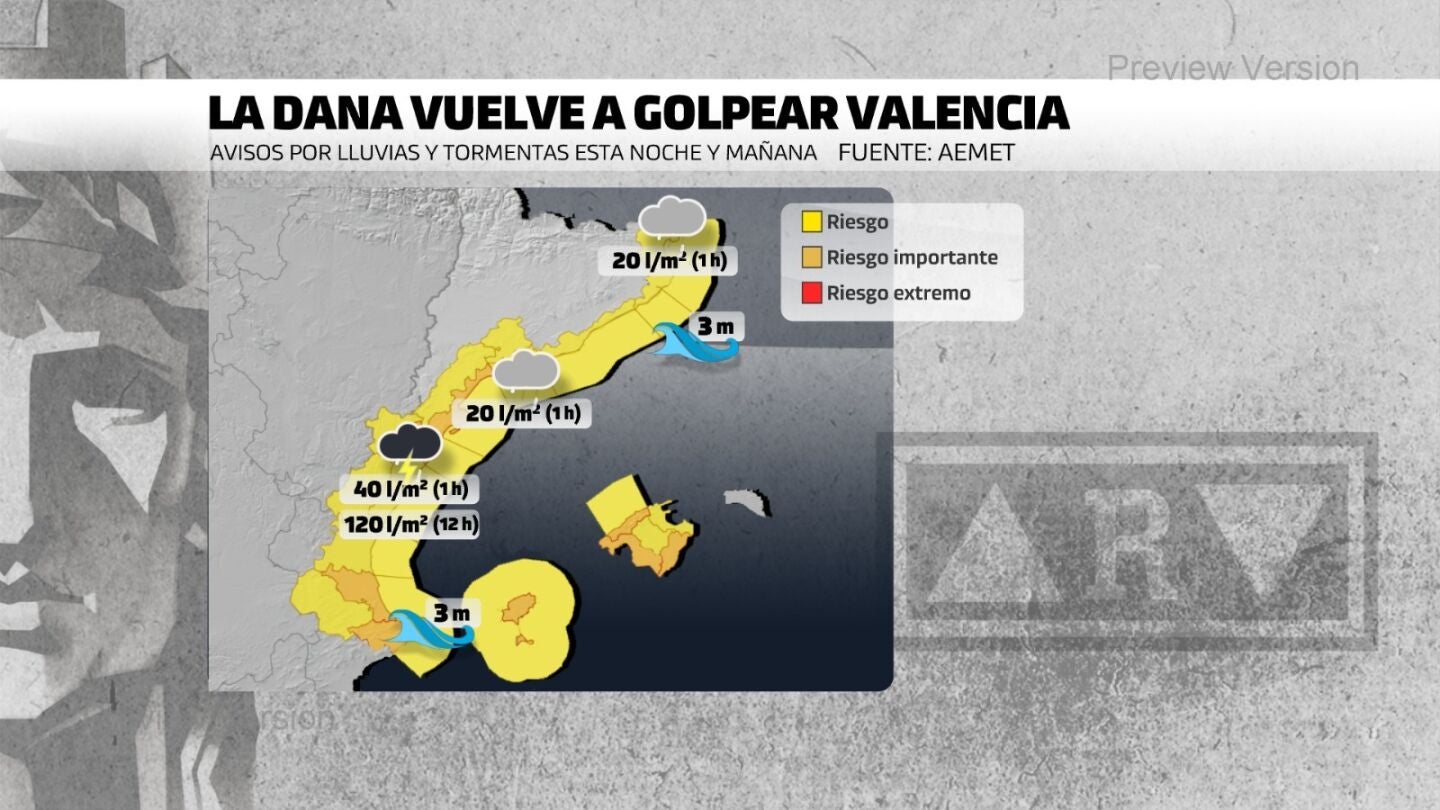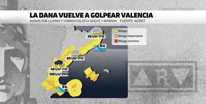 Una nueva DANA empeorará el tiempo a lo largo de este martes lo cual ha llevado a la Agencia Estatal de Meteorología (AEMET) activar un aviso especial por lluvias y chubascos muy fuertes que pueden resultar ser torrenciales. Las zonas afectadas, según la última actualización, serán Baleares, Levante, la provincia de Málaga y Andalucía occidental. En estas zonas, asegura el organismo, se pueden acumular más de 100 a 120 litros por metro cuadrado en 12 horas. Es por ello que pide "mucha precaución".