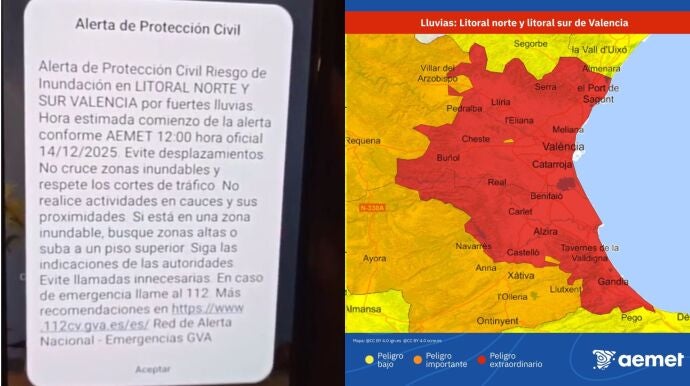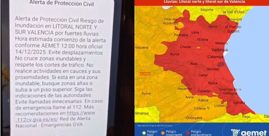 La Conselleria de Emergencias e Interior, a través del Centro de Coordinación de Emergencias de la Generalitat Valenciana (CCE), informa de la emisión de un aviso especial que alerta de la llegada, este domingo, de precipitaciones que puedan ser intensas, acompañadas de tormentas, en la Comunidad Valenciana. Por su parte, Aemet ha alertado de un aviso rojo por lluvias torrenciales en los litorales norte y sur de Valencia, también en la zona que fue devastada por la fatídica DANA del 29 de octubre, y Valle del Almanzora y los Vélez en Almería.