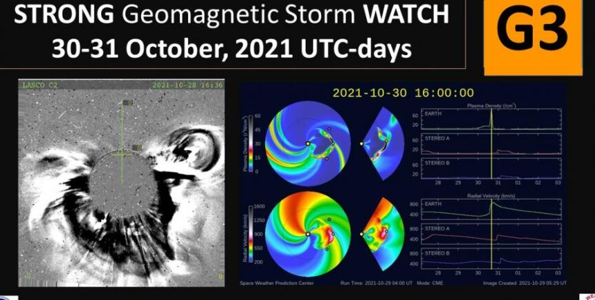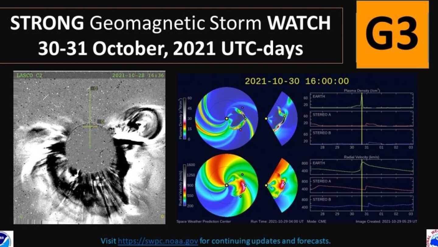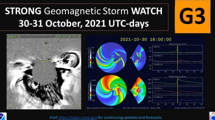 De acuerdo con esta entidad, esta eyección de masa coronal de la llamarada abandonó el astro a una velocidad de 973 kilómetros por segundo y se prevé su llegada a la Tierra este sábado 30 de octubre, con efectos que "probablemente continúen" el domingo, 31 de octubre.