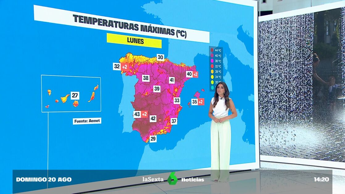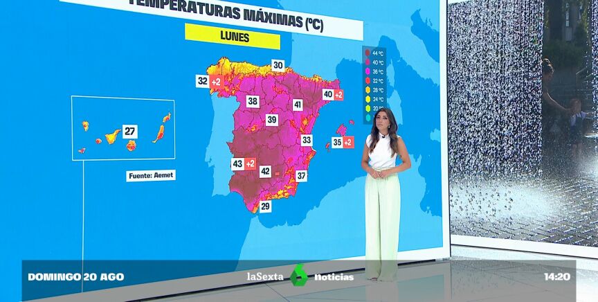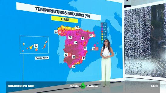 La Aemet prevé que el lunes y el martes se superen también los 40 ºC en amplias áreas de los cuadrantes suroccidental y nororiental peninsulares, y los 36-38 ºC en el interior, Mallorca y el sur de Galicia.