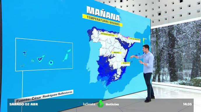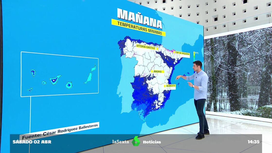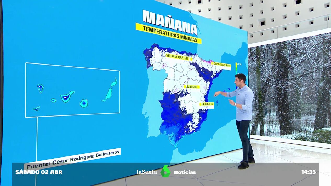 En plena primavera, hemos empezado este fin de semana con ambiente de lo más invernal: nieve, mucho frío, fuerte viento e intenso oleaje. Y parece que la situación no va a cambiar durante el fin de semana, especialmente en el norte. Hasta siete comunidades están en alerta por nevadas, viento, fenómenos costeros y frío, tal y como ha señalado Francisco Cacho, meteorólogo de laSexta.