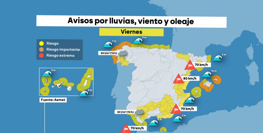 Este viernes, la situación en Andalucía será complicada debido al riesgo de inundaciones y la crecida de los ríos, lo que ha llevado a desalojos preventivos. La Península seguirá bajo la influencia de la borrasca Leonardo, con rachas muy fuertes de viento y fuerte oleaje en algunas zonas. Se esperan cielos nubosos y precipitaciones en la vertiente atlántica, Alborán y Aragón, con lluvias intensas en el oeste de Galicia y del Sistema Central. En el Cantábrico y Baleares, las lluvias serán débiles. Además, habrá nevadas en montañas del norte. Las temperaturas descenderán, con heladas en las montañas del norte. El viento será moderado del oeste y suroeste, con rachas fuertes en Baleares y en litorales del sur. En Canarias, el viento será moderado del norte. En Córdoba, el Guadalquivir está en riesgo de desbordamiento, y en Cádiz, el Guadalhorce sigue aumentando, lo que ha llevado a evacuaciones y vigilancia en varias provincias.