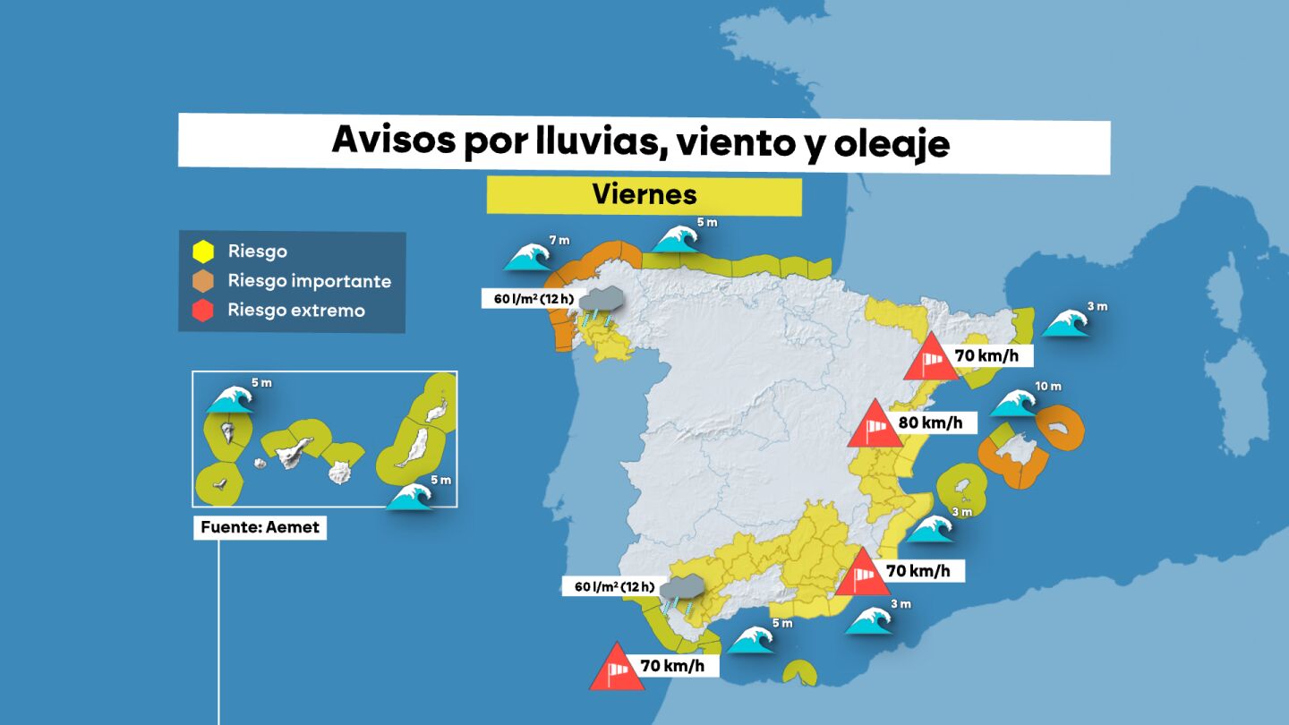 También se prevén nevadas en montañas de la mitad norte, con una cota situada entre los 1.100 y 1.500 metros, que podrá descender hasta los 900 metros en el noroeste al final del día, y entre 1.400 y 1.800 metros en las del sureste. En Canarias, habrá cielos nubosos con posibilidad de alguna lluvia débil y dispersa al principio, tendiendo a poco nuboso.