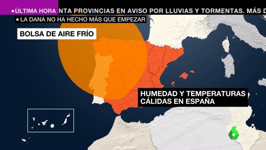 "La primera parte es la parte delantera de la DANA en la cual el aire frío se está metiendo debajo del aire caliente que teníamos antes, asciende de forma muy brusca, y genera las tormentas", explica la meteoróloga de laSexta Noticias Isabel Zubiaurre. Así, se forma este boom inicial.