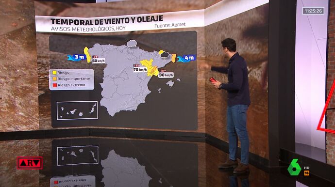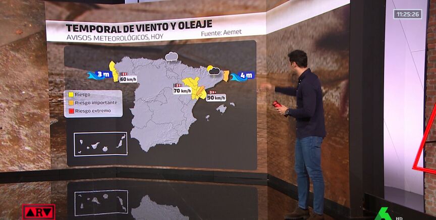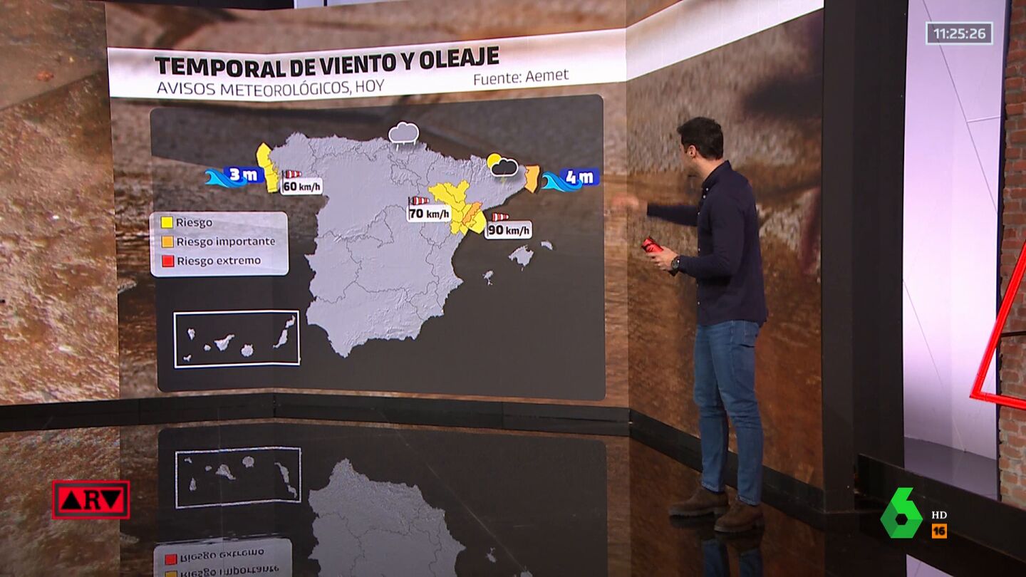 La lluvia visitará zonas del Cantábrico, donde siguen necesitando hoy el paraguas. Además, hay cuatro comunidades (Cataluña, Aragón, Galicia y Comunidad Valenciana) con avisos por viento y oleaje.