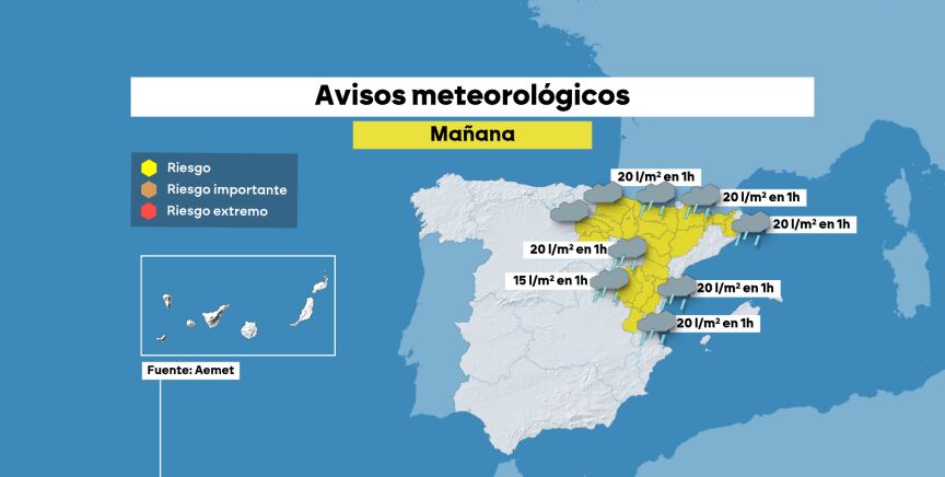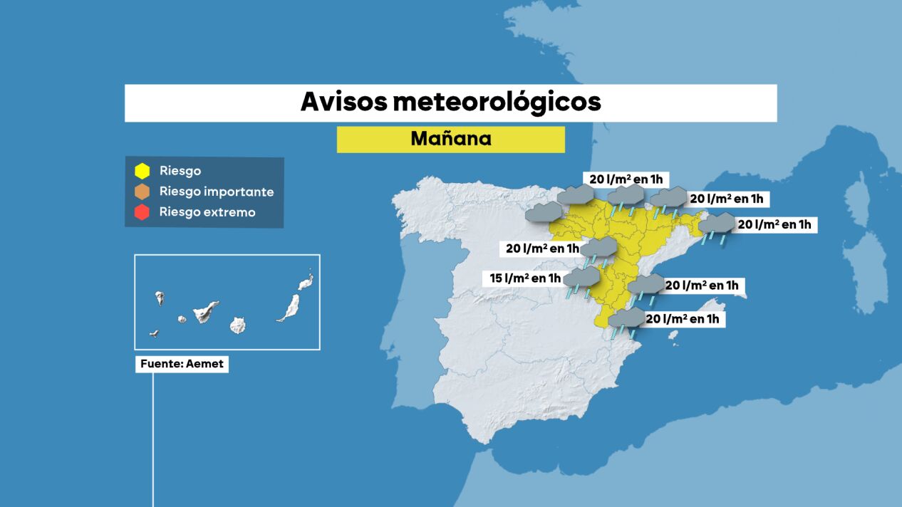 Para el domingo, las tormentas previstas dejarán avisos amarillos en gran parte del noreste peninsular. Según ha informado la Agencia Estatal de Meteorología (AEMET), se esperan 15-20 litros por metro cuadrado en Aragón, Cataluña, y el norte de Castellón.