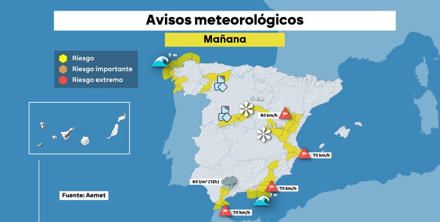 En cuanto al viento, Almería, Granada, Teruel, Murcia, Castellón, Valencia, Alicante y Ceuta estarán bajo aviso por fuertes rachas de viento que rondarán los 70-80 km/h. Además, se esperan fenómenos costeros adversos en Almería, Cádiz, Granada, A Coruña y Lugo, donde el oleaje podría alcanzar los cinco metros de altura, indica Europa Press.