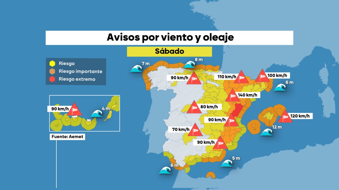 De esta forma, continuarán los vientos muy fuertes este sábado, cuando incluso incrementarán su intensidad en zonas del este peninsular y de Baleares. Un día más las rachas superarán los 100 km/h y además seguirá el mal estado de la mar tanto en el norte como en el Mediterráneo, con olas superiores a siete metros en ambos casos.