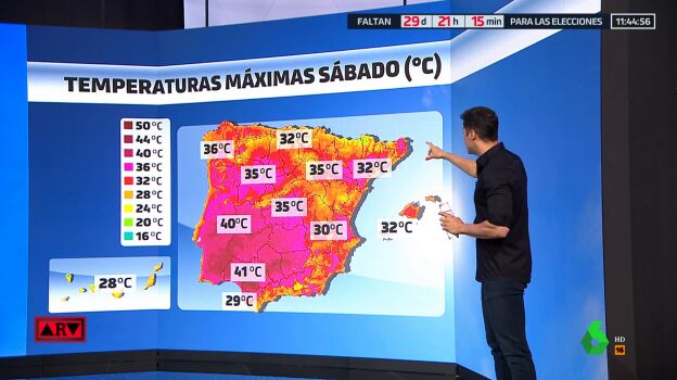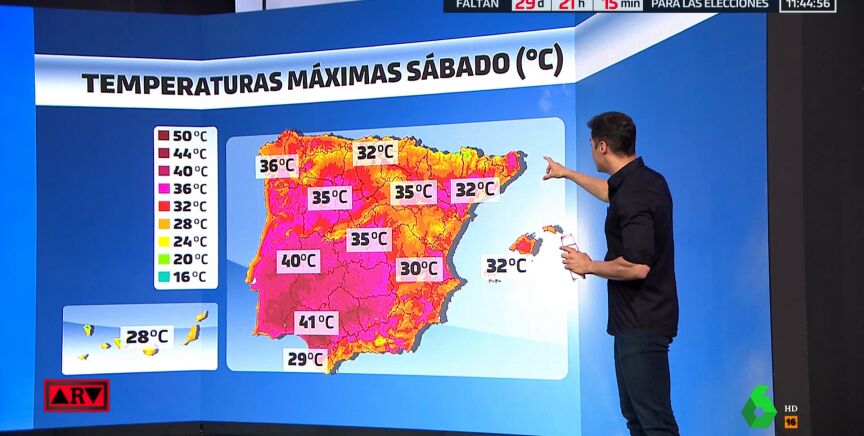 El domingo el mercurio bajará solo allí y volverán a subir en el resto, con media España ya en aviso por calor, que llegará a la zona metropolitana de Madrid y al norte, Aragón y Cataluña, con más de 38 grados en Zaragoza. Ese día las temperaturas rozarán incluso los 45 grados en Sevilla y Badajoz .