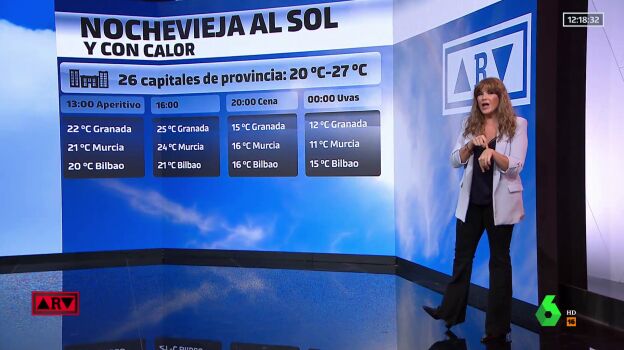 Como en abril o mayo y con temperaturas entre 10 y 15 ºC por encima de los habitual, el último día del año puede ser de récord. Las mínimas en la Nochevieja estarán también por encima de lo normal, entre 5 y 10 ºC por encima de lo habitual, excepto en las zonas de valle donde haya inversión térmica. Máximas: 24 ºC Granada 23 ºC Murcia, 22 ºC Oviedo, Pontevedra, 20 ºC A Coruña, Girona, Valencia, Palma, 21 ºC Bilbao, Cuenca, Sevilla, Teruel.