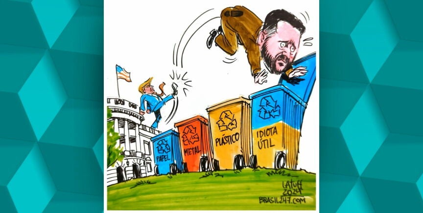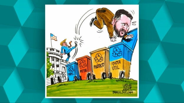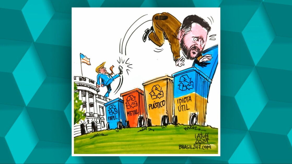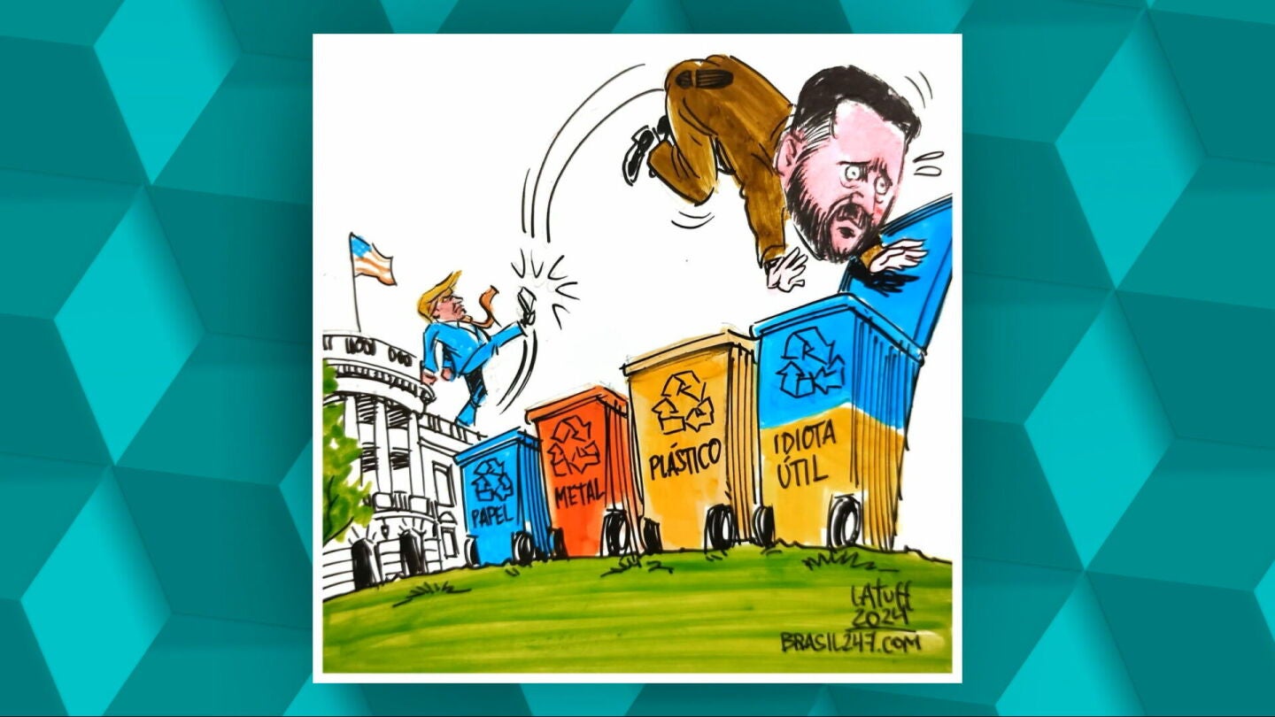 Una buena muestra del nivel de euforia que vivieron este viernes los medios de comunicación rusos tras el encuentro entre Donald Trump y Volodímir Zelenski es la caricatura que muchos de ellos ya han difundido en el que se ve al líder republicano dándole una patada en el trasero al presidente ucraniano para terminar mandándole a un contenedor de reciclaje de "idiotas útiles".