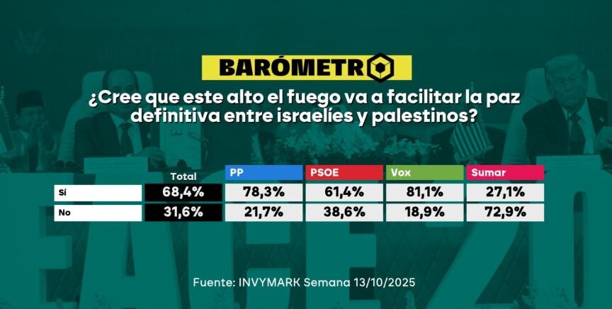 Además, el 68,4% cree que este alto el fuego va a facilitar la paz definitiva entre israelíes y palestinos con, de nuevo, gran fe en la derecha. Es en Vox donde hay mayores esperanzas puestas, con el 81,1% considerando que el fin de la guerra está más cerca. En el PP lo ven así el 78,3% de los encuestados.