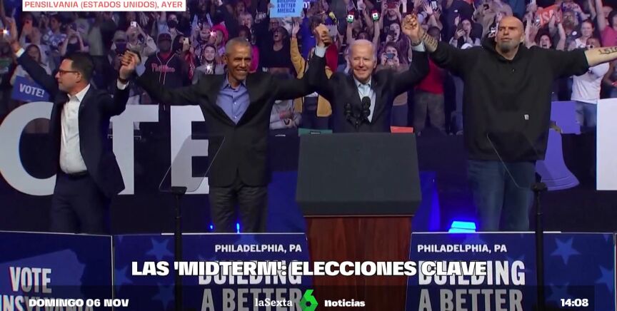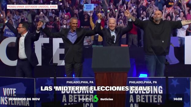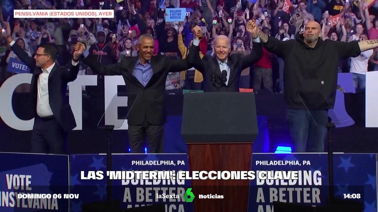 El presidente de Estados Unidos, Joe Biden, y el expresidente Barack Obama se han subido juntos al escenario junto a los candidatos demócratas de Pensilvania. Al mismo tiempo y en el mismo estado, Trump ha descendido de su avión para apoyar a los suyos. Y es que este es uno de los estados clave en estas elecciones de medio mandato; comicios en los que se renuevan los escaños de la Cámara Baja y un tercio del Senado de Estados Unidos.