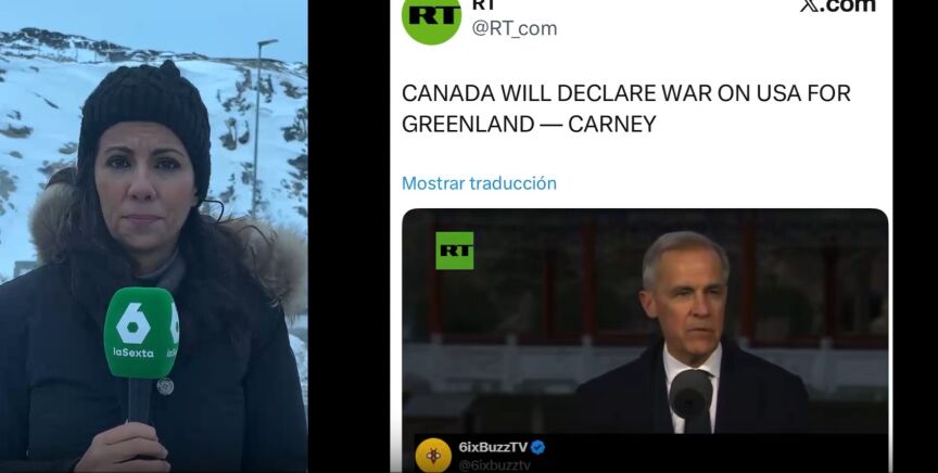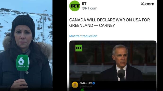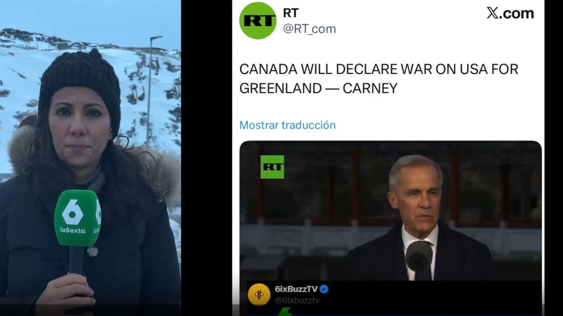 En Groenlandia, se ha detectado un intento de propaganda rusa que alienta una guerra en la región, a pesar de que hay un despliegue de tropas. Ana Pastor verificó personalmente una publicación en la red social X, donde se afirmaba falsamente que el primer ministro de Canadá instigaba un conflicto contra Estados Unidos por la situación en la isla. El vídeo, compartido por 'RT', la televisión rusa, es un intento de desinformación, ya que el primer ministro canadiense no ha hecho tal declaración. Aunque en España no se puede acceder al tuit, sí está disponible en Groenlandia y Dinamarca, donde se ha difundido este contenido falso.