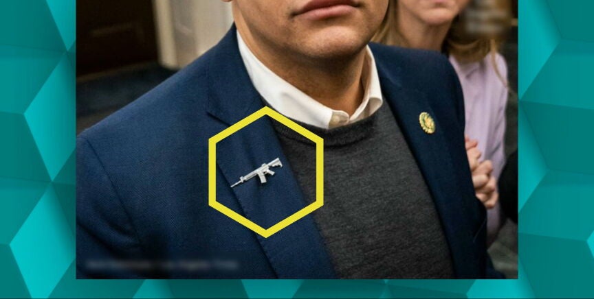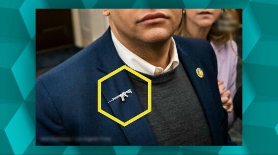 Pero la estética trumpista no se queda solo en la ropa. También llega a los símbolos. Los hay religiosos, como la cruz que luce habitualmente Karoline Leavitt. Y los hay armamentísticos. Algunos republicanos han sustituido el tradicional pin de la bandera estadounidense por pines con fusiles, colocados exactamente en el mismo lugar.