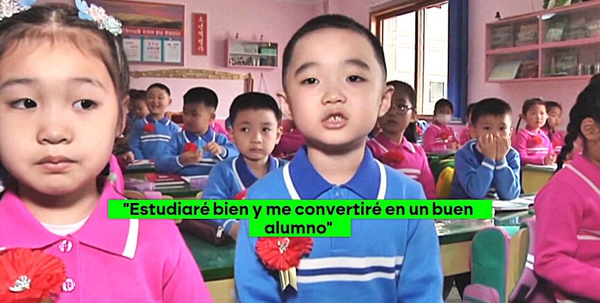 En colegios situados en la capital de Corea del Norte, en Pionyang, los niños empiezan las clases en abril y las terminan en febrero del año siguiente, con un pequeño parón veraniego. "Estudiaré bien y me convertiré en un buen alumno", asegura uno de los pequeños que inician este curso escolar. Como para decir que le dan pereza las clases, porque aquí lo principal es demostrar que saben la lección: la de alabar la personalidad del líder.