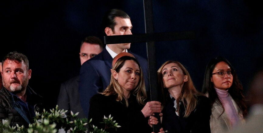 El papa Francisco ha presidido este viernes el Vía Crucis en Roma desde un palco habilitado en el Monte Palatino, justo delante del Coliseo, un sugestivo escenario símbolo de los primeros mártires cristianos arrojados a las fieras, y después de dos años de parón por la pandemia.