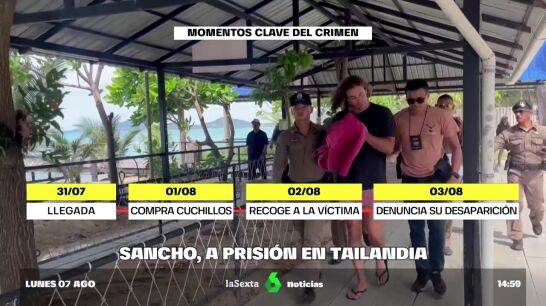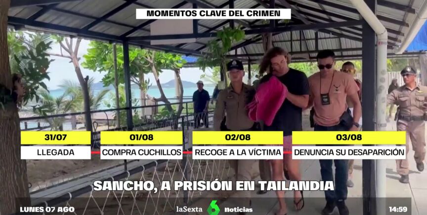 Prisión provisional para el joven español acusado de matar y descuartizar a un hombre en Tailandia. Ha sido trasladado a la isla de Koh Samui, donde previsiblemente será juzgado. Sancho ha mostrado su voluntad de colaborar con la Justicia.