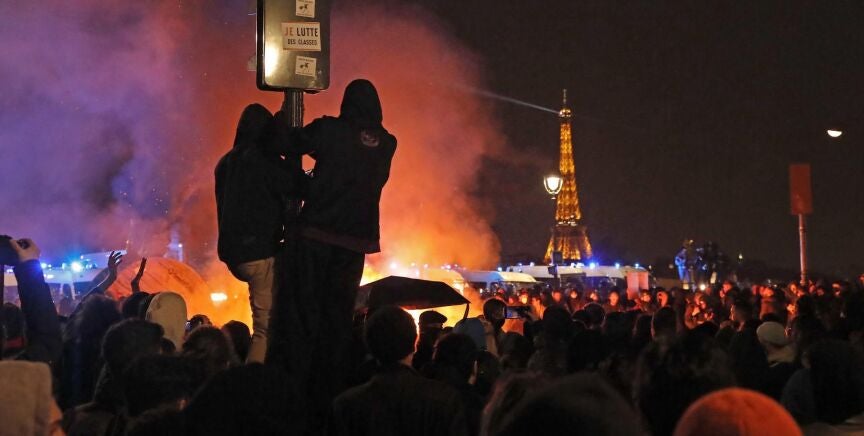 Tras la aprobación mediante un artículo de la Constitución por parte del Gobierno de Emmanuel Macron de la reforma de la pensiones, la cual aumenta la edad de jubilación de 62 a 64 años, miles de personas salieron a protestar violentamente. Incendiaron coches, contenedores y mobiliario. Las calles se convirtieron en auténticos campos de batalla. Las fuerzas de seguridad cargaron contra los manifestantes lanzando granadas de gases lacrimógenos y gas pimienta, así como potentes chorros de agua para dispersarlos.