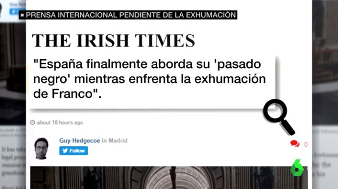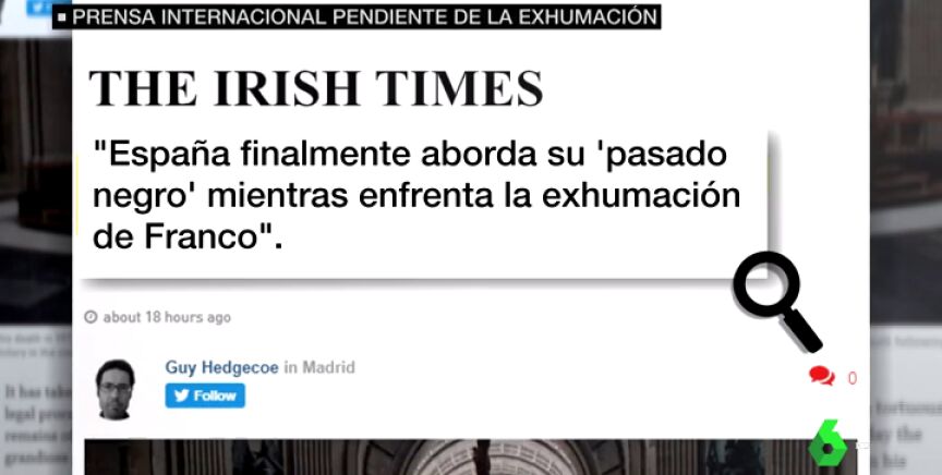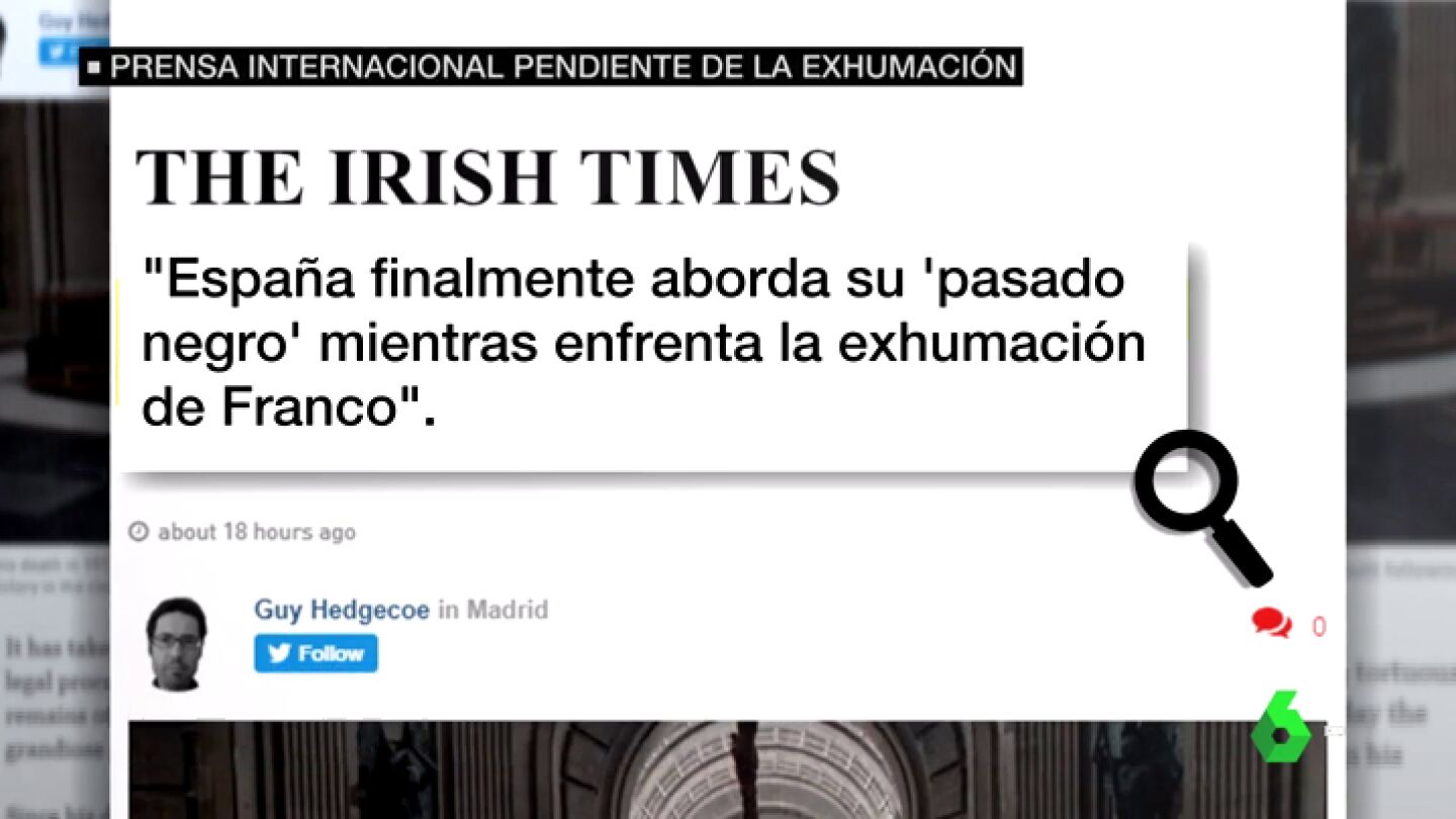 La exhumación de Francoha copado titulares en medio mundo. La cadena británica BBC ha abierto sus boletines con la salida del dictador del Valle de los Caídos. Por su parte, el medio irlandés The Irish Times ha destacado este titular: "España, finalmente, aborda su pasado negro al enfrentar la exhumación de Franco".