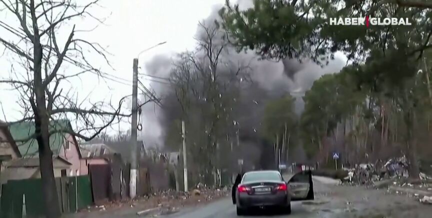 Un equipo de la televisión turca Haber Global, que cubre la invasión rusa en Ucrania, captó una espeluznante explosión en la ciudad de Irpin.