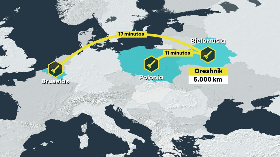 El presidente de Rusia, Vladímir Putin, ha colocado a Europa en su punto de mira después de que haya trasladado el misil hipersónico Oreshnik hasta Bielorrusia. Esta arma, según han detallado las autoridades, tiene un alcance de 5.000 kilómetros, por lo que podría golpear cualquier punto del Viejo Continente, incluida España.