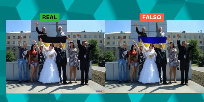 ¿Por qué es importante? En este tiempo hemos visto fotomontajes como el de un matrimonio haciendo el saludo nazi con la bandera de Ucrania, cuando en realidad es la bandera de la Dinastía Romanov rusa, u otro haciendo creer que Zelenski había comprado el coche de Hitler.